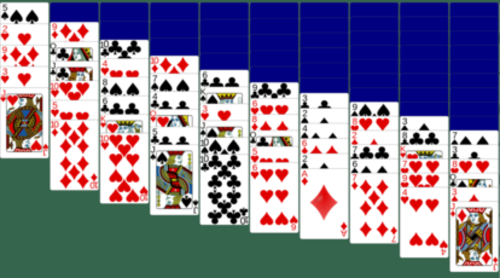 Double Russian Solitaire is a solitary card game designed for one player. The game begins with two decks of 52 cards (104 cards total). The tableau is formed by dealing out across the columns. One face-up card is placed in the first column, then face-down cards are placed in each of the other nine columns. Then a face-up card is placed in the first column, a face-up card is placed in the second column, then face-down cards are placed in each of the other eight columns. This pattern is repeated until the fifth column has a face-up card in it. From now on, move one column to the right to start laying face-up cards. So this time, start with column two, then the next time column three. Complete this pattern, laying all 104 cards in the 10 columns.